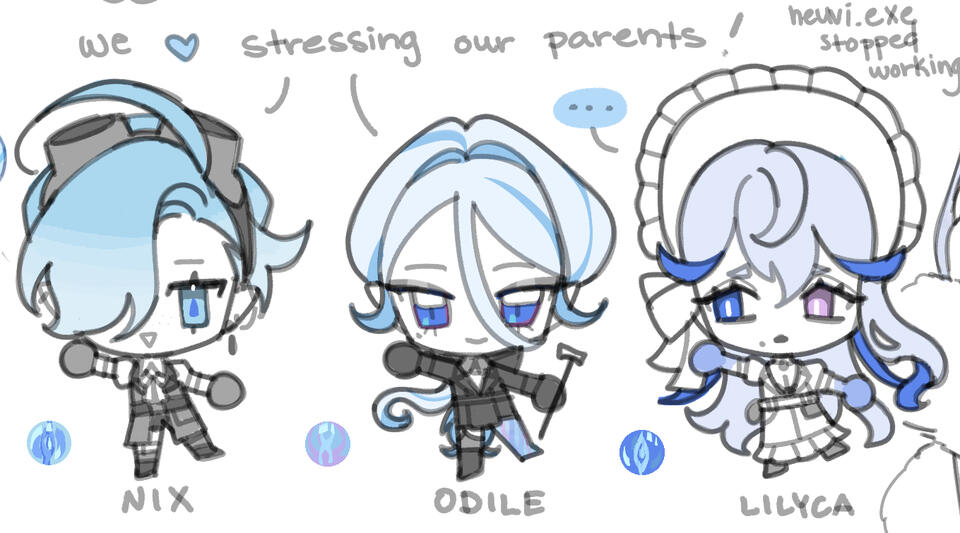 Nix, Odile, and Lilyca are clutch mates born days apart from each other. All of them did not have a human form upon birth and only gained the ability to shift between human and dragon once they were about a year old (although they weren't able to control it very well then). All of them are able to wield the power of hydro without a vision. Lilyca is the only one with a vision so her dad can keep an eye on her while she travels the continent. They are not identical triplets.As children, Nix liked to play with Odile while Lilyca always made sure that they were all safe. Odile feels bad that Lilyca is always worrying so she and Nix try to get her to loosen up a lot. The two do love their baby sister very much.All sisters are well versed in the law which is very helpful...Nix